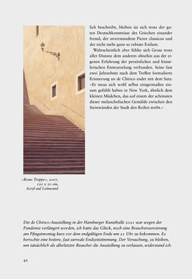 »War es nicht George Grosz, der irgendwann einmal festgestellt hat, dass Giorgio de Chirico einen Pferdekopf habe, fragte ich mich, als ich im Mai 2021 vor der Zeittafel der de Chirico-Ausstellung in der Hamburger Kunsthalle stand und ein Porträtfoto von ihm betrachtete. Ich glaubte mich zu erinnern, dieses ebenso treffende wie wenig schmeichelhafte Urteil in der Autobiografie von Grosz ›Ein großes Nein und ein kleines Ja‹ von 1955 gelesen zu haben.